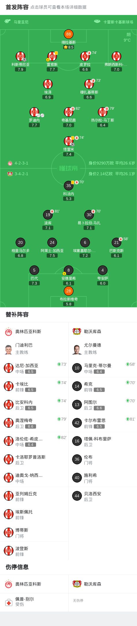 勒沃庫森0-2客負(fù)奧林匹亞科斯,塔雷米、科斯蒂尼亞建功