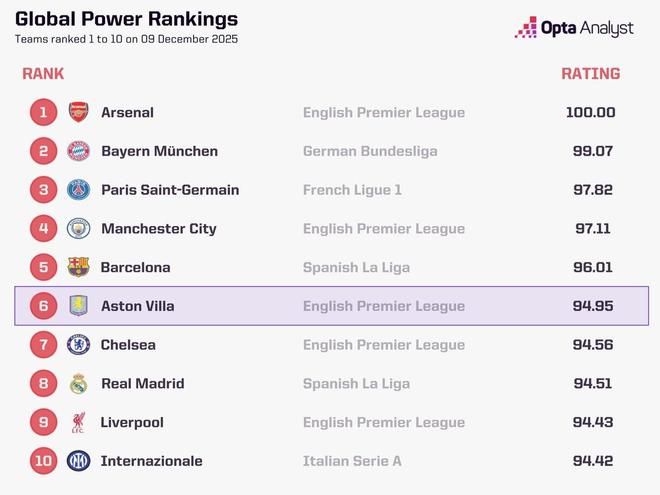 Opta全球俱樂(lè)部當(dāng)前實(shí)力榜:阿森納、拜仁、巴黎前3,維拉第6 -